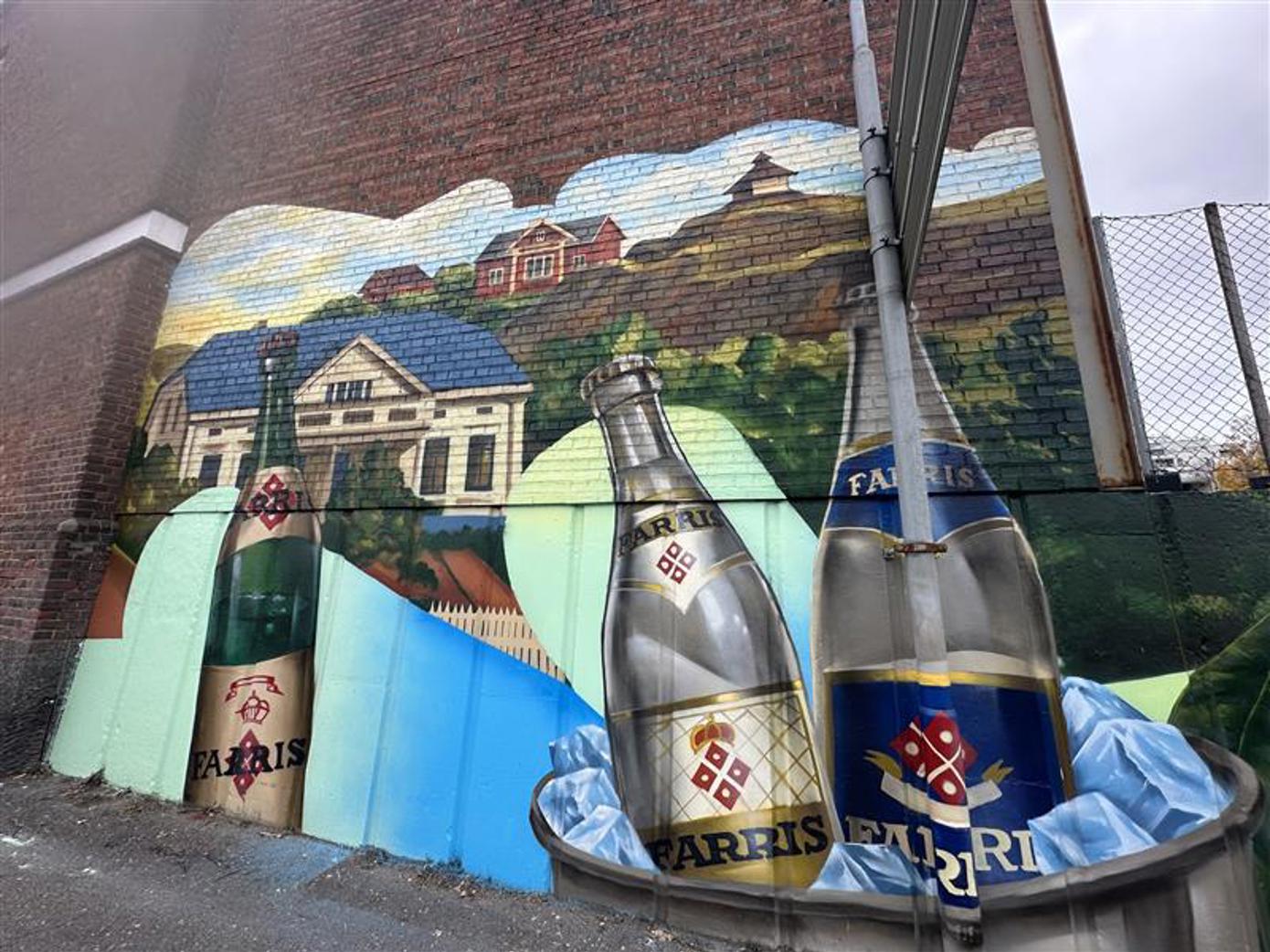 – Vi har lenge hatt et ønske om å gjøre noe med den triste betongveggen langs veien ved Farris-fabrikken. Det er en ganske stor flate, så vi tenkte det hadde vært artig å se på hvordan vi kunne utnytte den til å vise frem Farrishistorien, sier Juliane Øyslebø, markedssjef for vann i Ringnes.